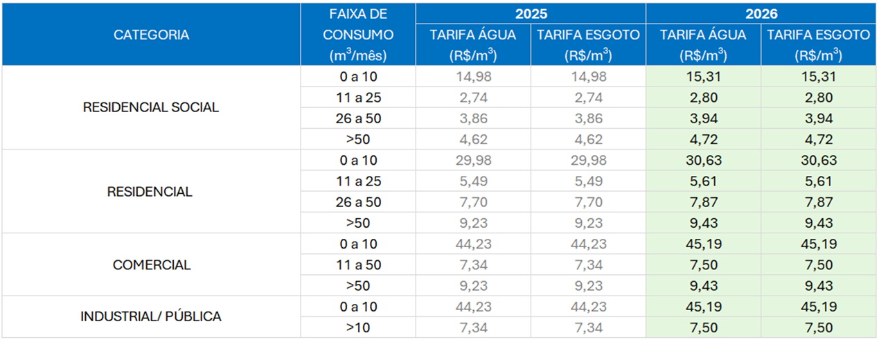 Os usuários classificam-se em categorias divididas em residencial social, residencial, comercial, industrial e pública. Para cada uma delas existe uma tabela com os valores estabelecidos para o consumo de até 10 m³, também chamada de taxa mínima, com aumento conforme a demanda de consumo. Cabe esclarecer que os consumidores residenciais com menor poder aquisitivo também possuem uma regra diferenciada, desde que observadas algumas condições fixadas pela Ilhota Saneamento. Para isso, o interessado deve comparecer a nossa loja de atendimento para outros esclarecimentos.